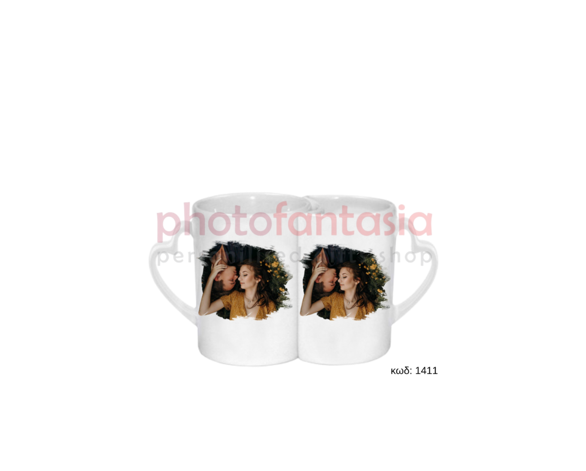 A 2-piece set of white ceramic mugs with heart-shaped mug handles. The two cups have a shape that touches each other. Personalize your mug by printing the photo you want on the mug.